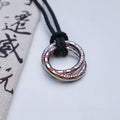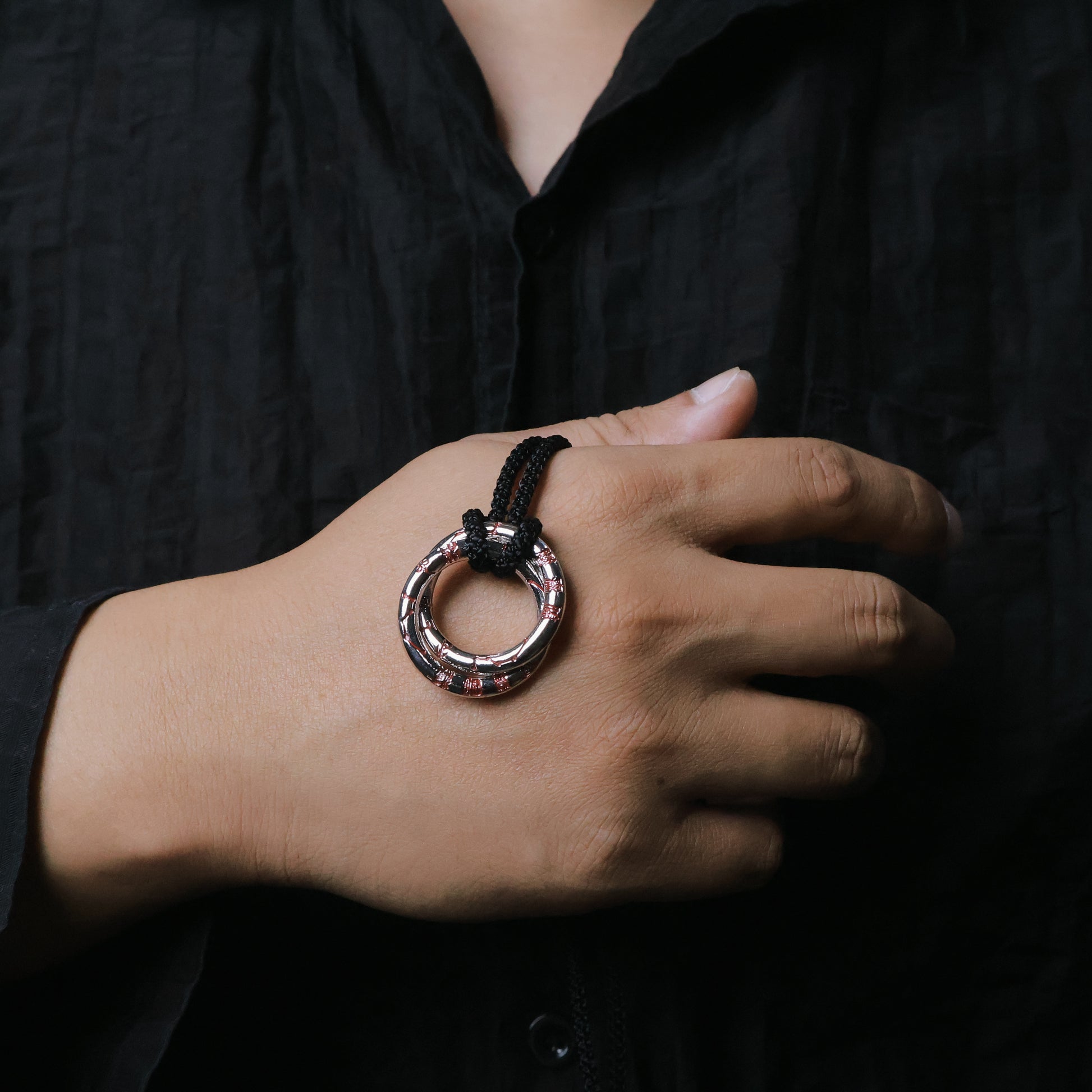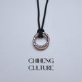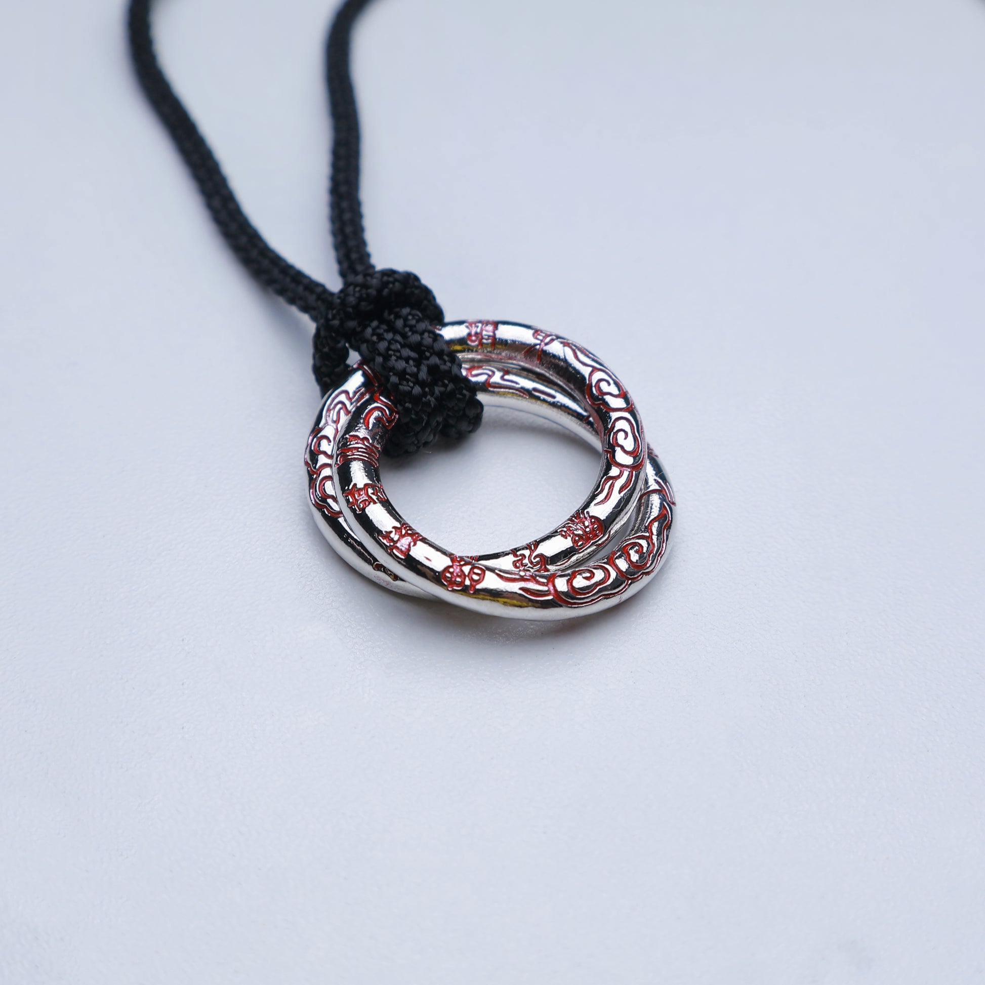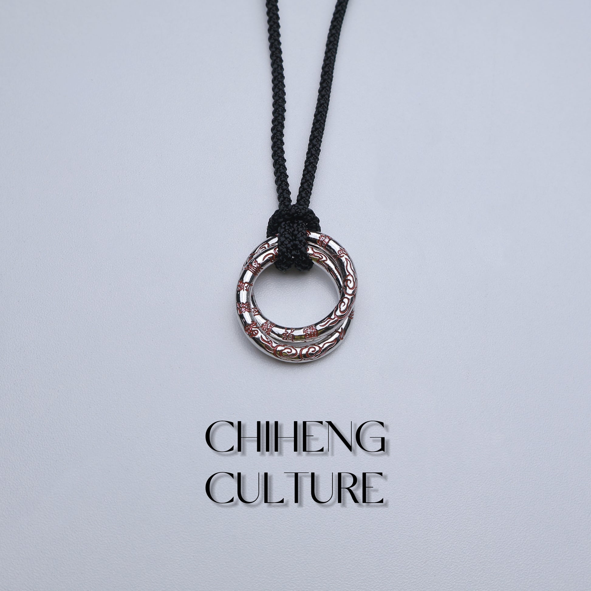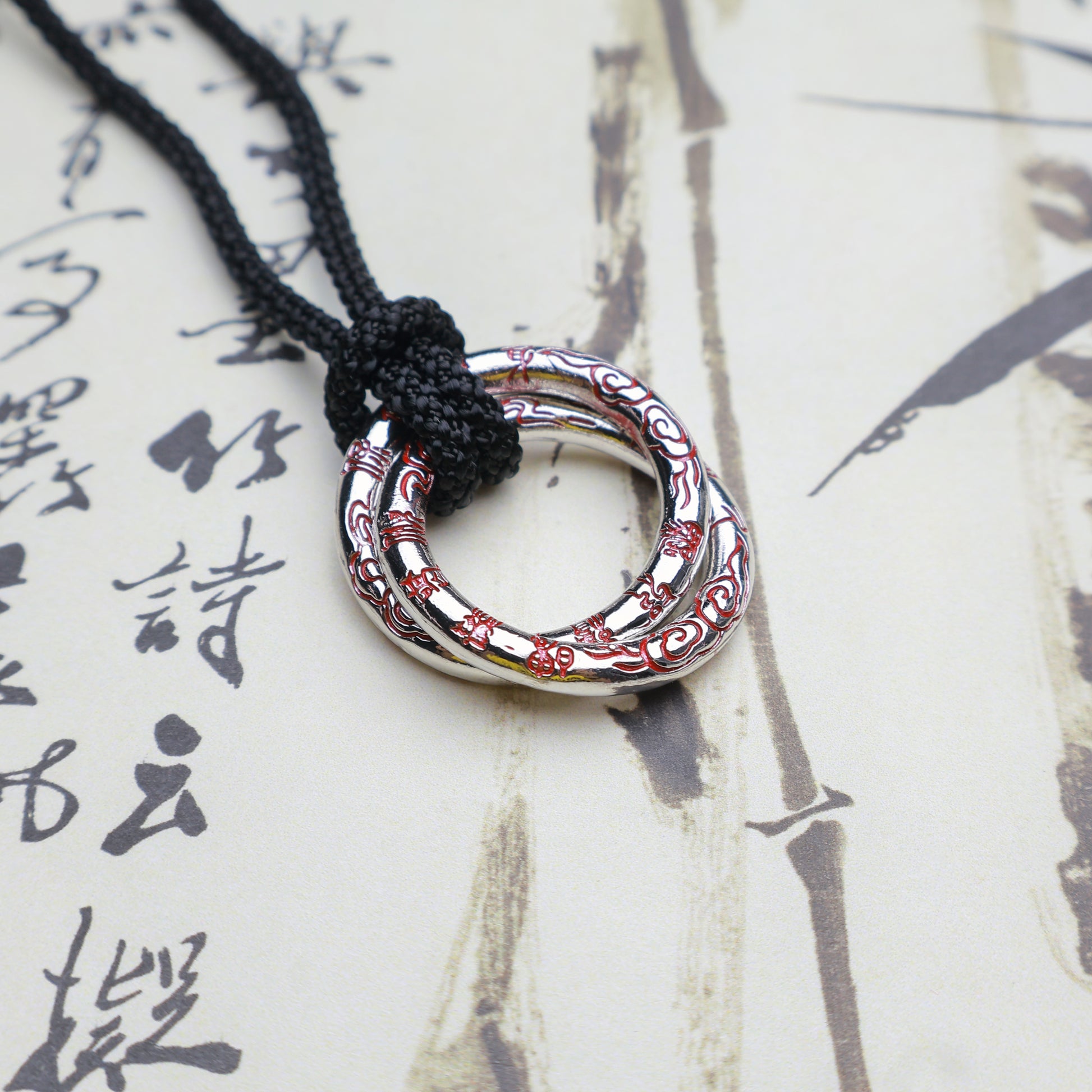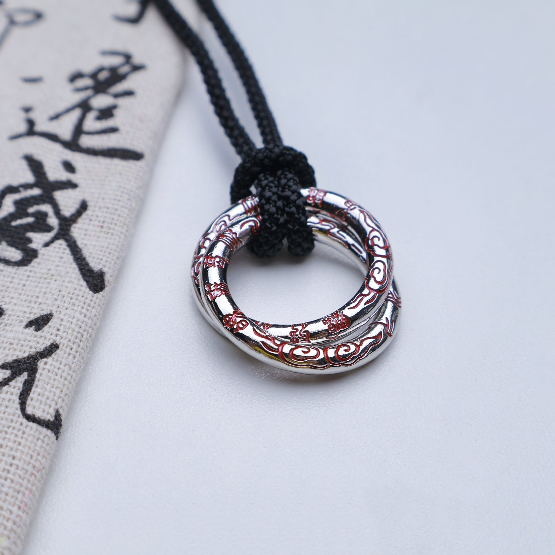 Crafted from premium metals, the pendant features two interlocking Heaven-Earth Rings, their surfaces intricately carved with swirling cloud patterns. The Seven-Star Mantra is subtly integrated into the design – not as a mystical incantation, but as a decorative element celebrating cultural heritage. Each piece undergoes meticulous casting, polishing, and engraving, ensuring durability and precision. It comes paired with a hand-woven black cord, blending traditional textile art with contemporary wearability.